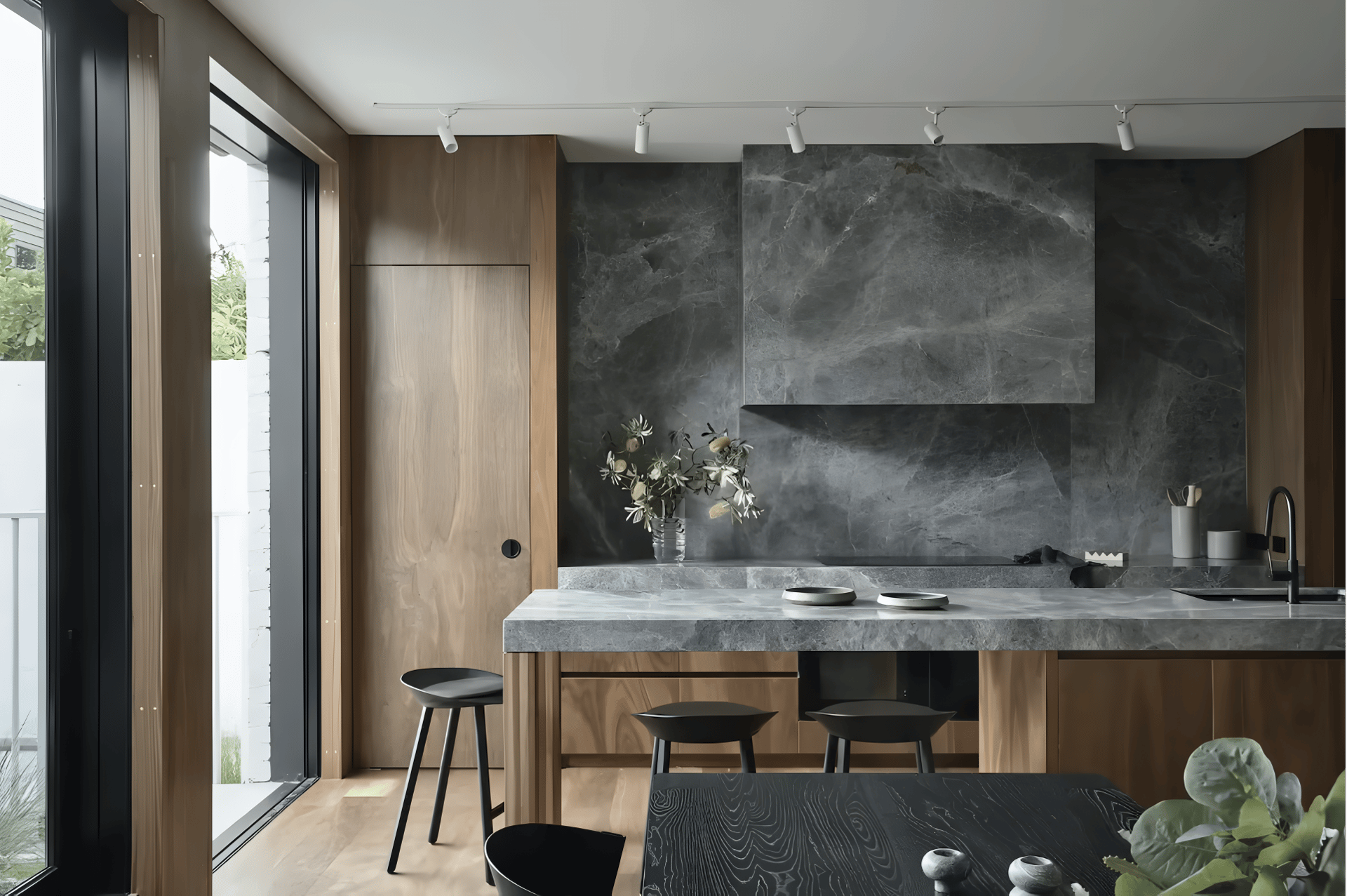 With our desire for more dramatic spaces, many homeowners are opting for bold marble statement pieces in their kitchens. Use marble with unique veining styles and richer colors to create a strong focal point. When paired with beautiful woods and timber joinery, it generates a powerful impact that emanates a dark and moody vibe.