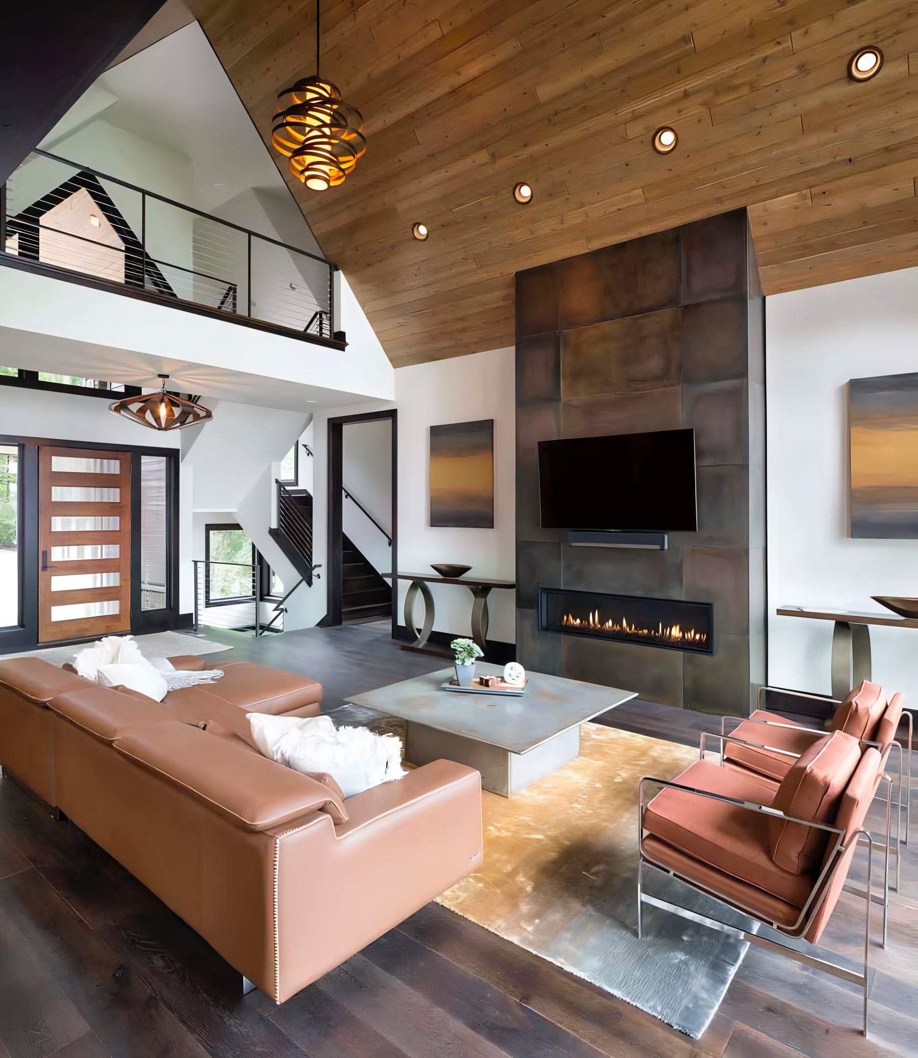 This airy living space offers the perfect balance of rustic woods and refined furnishings to create a sense of warmth, coziness, and modern sophistication. Mood-altering lighting features, abstract artwork, and area rugs that echo the artwork’s hues contribute to the tranquil vibe of the room. Plus, the focal-point fireplace and TV wall provide the ideal gathering spot for entertaining friends and family at the lake.